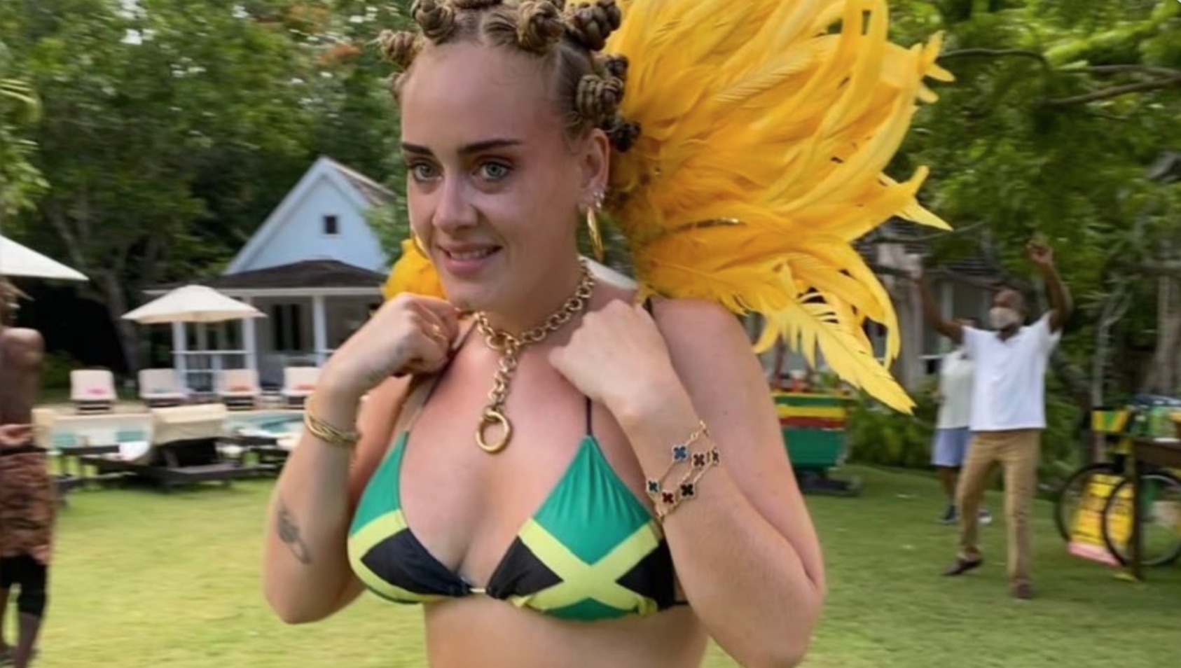 The Adele Notting Hill Carnival photo went viral in August 2020 after the singer posted an image of herself celebrating the cancelled London festival from her garden. Sporting Bantu knots and a Jamaican flag bikini top, the image immediately sparked massive internet discourse regarding cultural appropriation and appreciation. Beyond the controversy, the meme community embraced the photo as a hilarious template for 'transformation' jokes, often used to describe someone who adopts a new culture or accent after a very short stay abroad. Its popularity persists due to Adele's confident yet unexpected styling, serving as the perfect visual for being 'extra' or overly enthusiastic about a new hobby or identity.